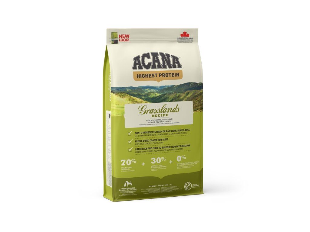 ACANA GRASSLANDS OBSAHUJE MASO Z VOLNĚ CHOVANÝCH JEHŇAT, KACHEN A KRŮT, VEJCE Z HNÍZDNÍCH CHOVŮ A RYBY, VŠE DODÁVANÉ ČERSTVÉ NEBO SYROVÉ Z NAŠEHO REGIONU V PODÍLU CELÉ KOŘISTI, COŽ DODÁVÁ ŽIVINY PŘIROZENĚ, BEZ POTŘEBY DLOUHÉHO SEZNAMU UMĚLÝCH DOPLŇKŮ. S NÍZKÝM OBSAHEM SACHARIDŮ A VYSOKÝM OBSAHEM ŽIVOCIŠNÝCH PROTEINŮ PRO DOSAŽENÍ VRCHOLOVÉ KONDICE.
