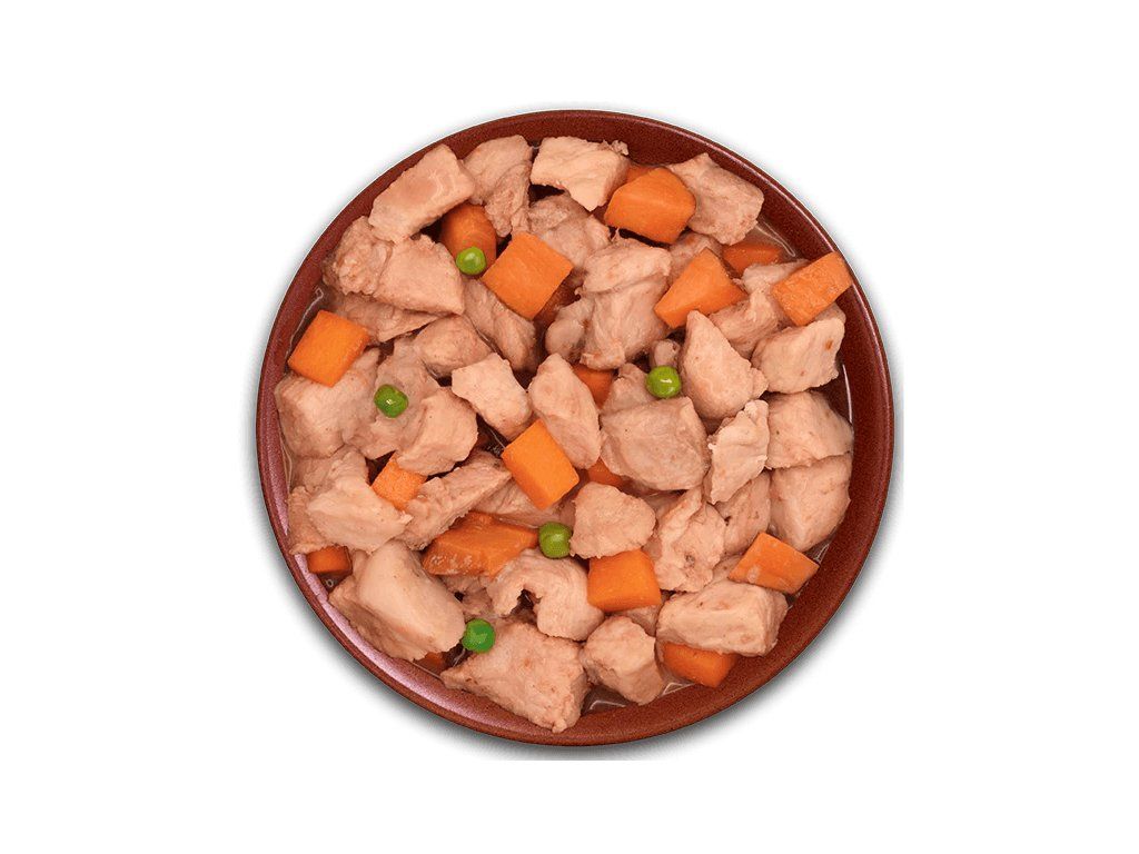 97% čerstvé vepřové maso v omáčce, hrášek, mrkev, sladké brambory, koření.