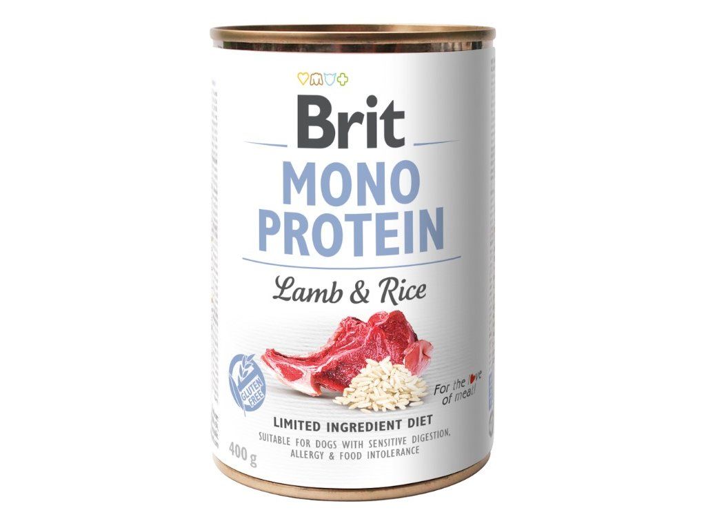 Superprémiová konzerva Brit MonoProtein obsahuje 100% čistého jehněčího masa s rýží. Je vhodná pro psy s citlivým zažíváním, alergiemi a potravinovou intolerancí.