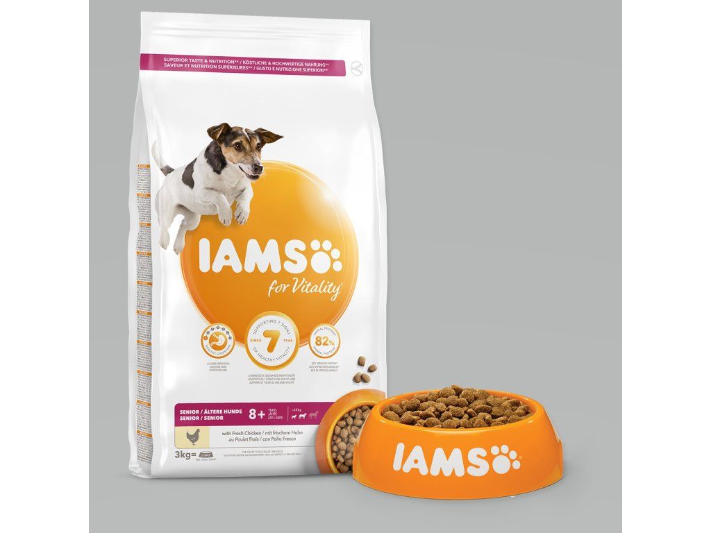 Krmivo IAMS for Vitality pro psí seniory malých a středních plemen je 100% kompletní a vyvážené, odborníky sestavené krmivo, které bude vašemu zvířeti chutnat a svědčit. Naše nová a vylepšená receptura pro psí seniory s čerstvým kuřecím masem je založena na pečlivě vybraných, kvalitních živočišných bílkovinách, které podporují sedm znaků zdravé vitality psa. Aby byl váš pes zdravý, aktivní a plný energie, obsahují naše lahodné receptury až 82 % živočišných bílkovin (z celkového obsahu bílkovin).