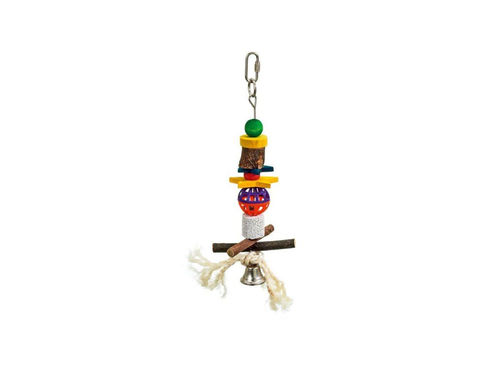 Barevná dřevěná houpací hračka pro ptáky se zvonečkem z přírodních materiálů.