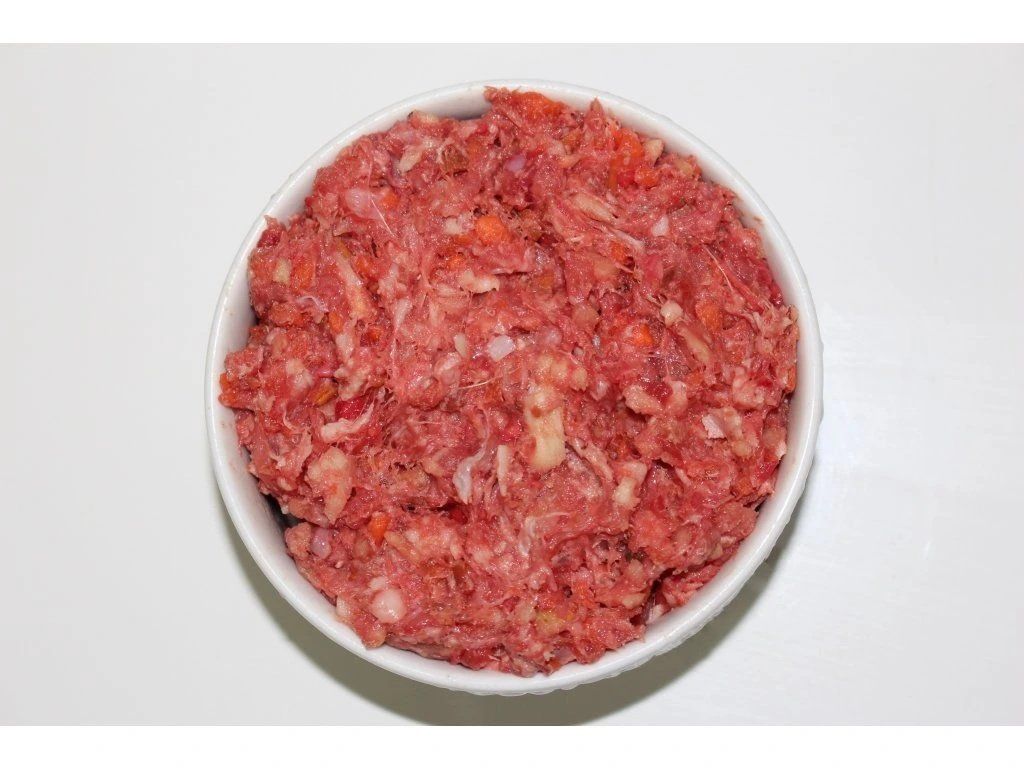 60% králičí maso s kostí, 20% srdce, plíce, ledvinky, 20% zelenina (mrkev a zelí nebo mrkev a petržel dle dostupnosti zeleniny)