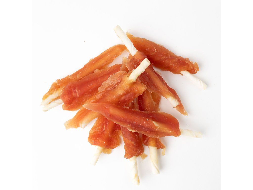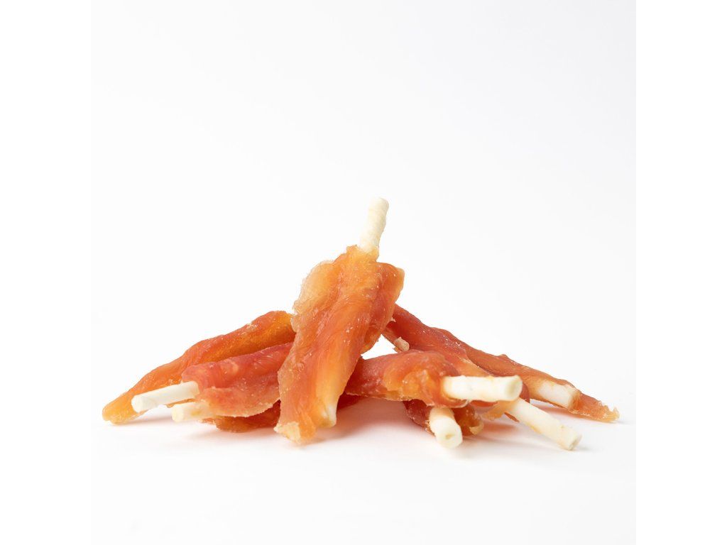 Přírodní masová pochoutka z kuřecí svaloviny na rolované tyčce hovězí kůže.