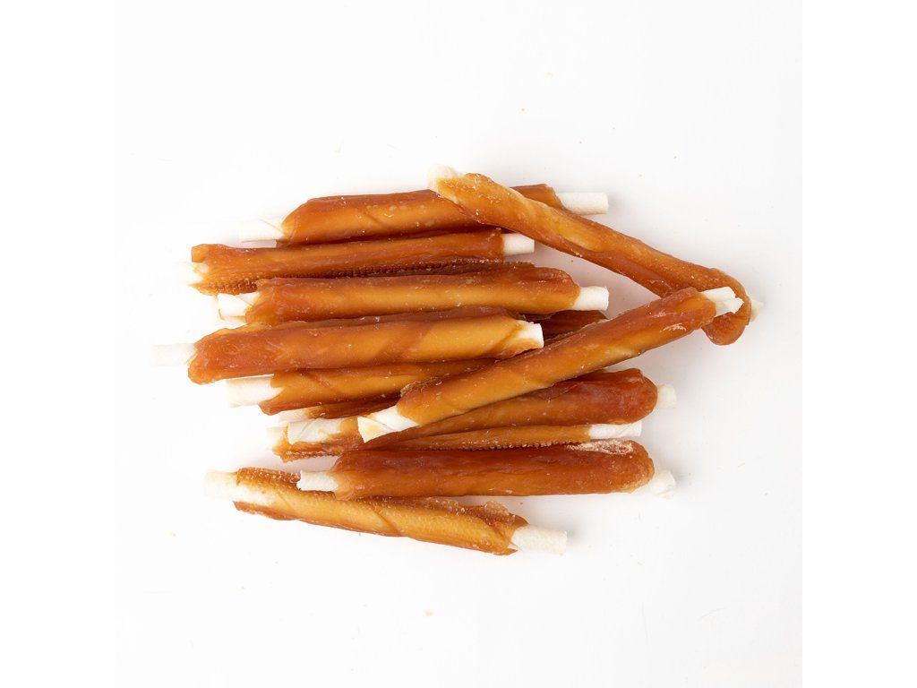 Přírodní masová tyčka z hovězí kůže obtočená plátkem lahodného kuřecího masa.