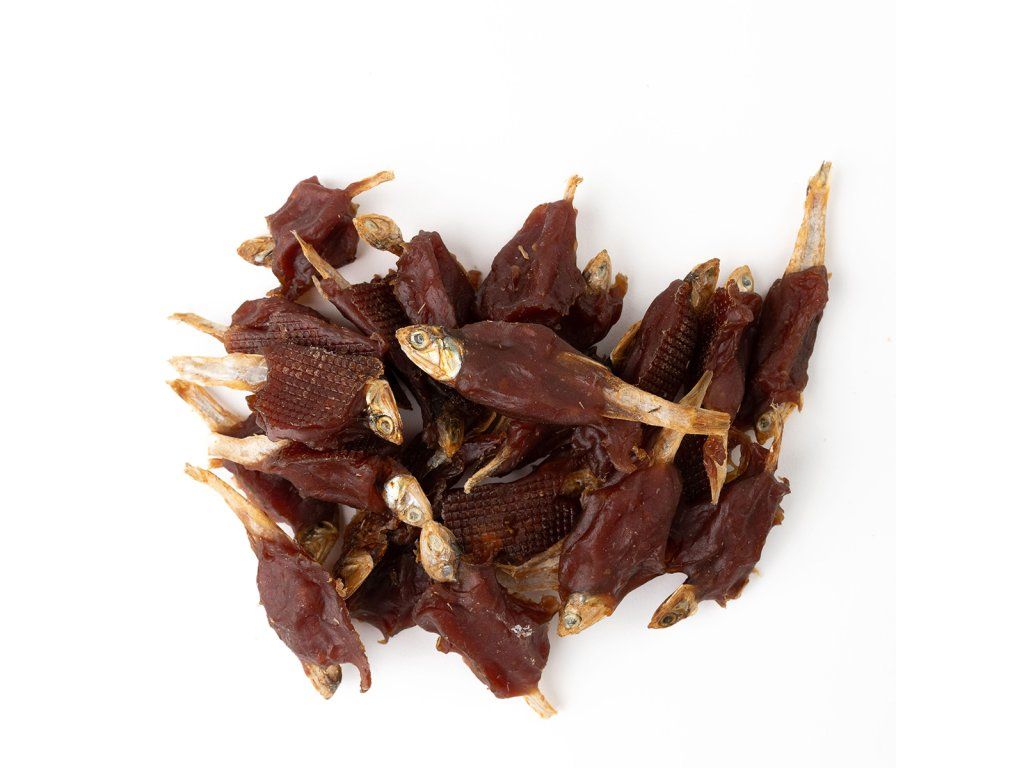 - Cca 8cm dlouhá rybička, omotána kachním masem a usušena.