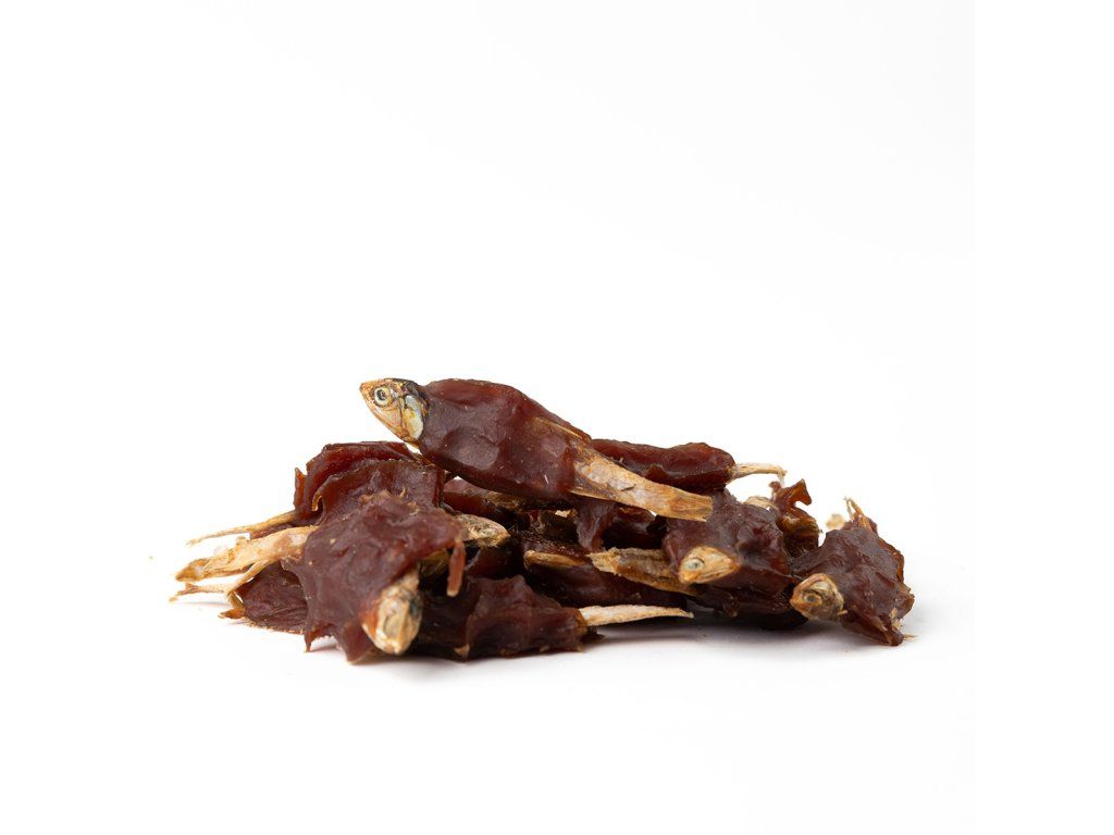 Měkká, přírodní masová pochoutka pro psy. Sušená rybička omotaná sušeným kachním masem.