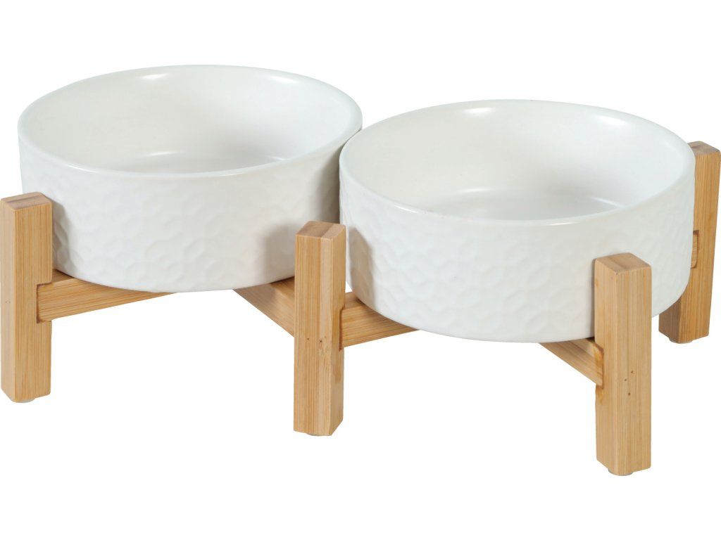 2 keramické misky pro psy i kočky v elegantním designu. Misky jsou na společné bambusové podnoži, která je opatřena protiskluzovými podložkami.