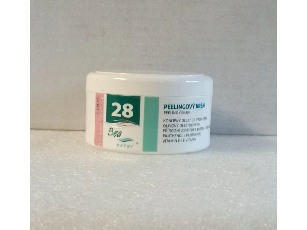 BEA natur –č.28-Peelingový krém s velmi jemným abrazivem k odstranění odumřelých kožních buněk a k revitalizaci kůže pro plemena bez srsti ( naháči). Obsahuje konopný olej vysoké kvality, který dokáže harmonizovat stav kožních buněk, účinně vyrovnává hydratační, lipidovou i pH rovnováhu pokožky, přispívá i k obnovově ochranného kožního pláště a tedy zvyšuje celkovou odolnost pokožky vůči působení negativních vnějších vlivů. Chrání před infekcemi a ztrátou vlhkosti, je bohatým zdrojem omega 3 a omega 6 nenasycených mastných kyselin. Olej je THC free- neobsahuje žádné psychoaktivní látky. Dále obsahuje přírodní vosk Shea Butter (přírodní látka z oříšků máslovníku - stromu Butyrospermum Parkii), který zjemňuje a zvláčńuje kůži, vyživuje do hloubky a podporuje obnovu tkání. Panthenol a vitamín E doplňují jedinečnou kombinaci aktivních látek tohoto krému . Díky velmi jemnému abrazivu dochází k odstraňování odumřelých kožních buněk a k revitalizaci kůže. Výrobek omezuje tvorbu akné a podporuje jeho léčbu.Při pravidelném používání peeling zlepšuje stav a vzhled pokožky. Velmi jemná parfemace.