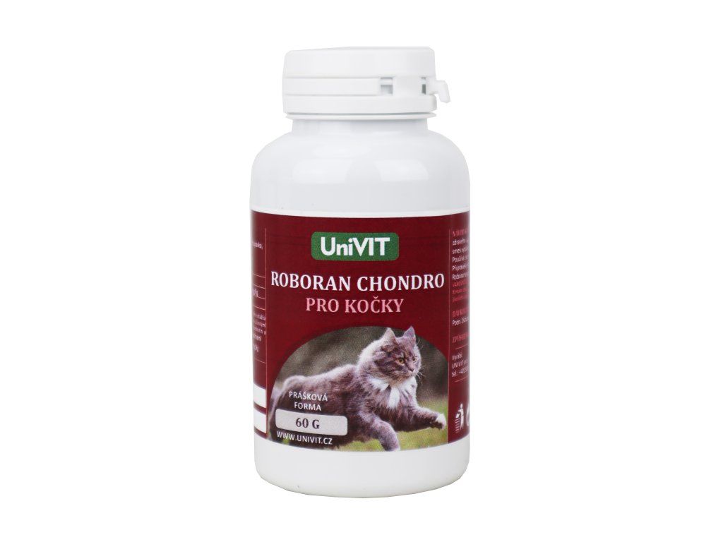 Speciální doplňkové krmivo pro kočky s obsahem směsi výtažků z mořských živočichů. Použitím přírodní suroviny je dosaženo optimálního poměru chondroitinsulfátu, glukosaminsulfátu a 3-omega mastných kyselin. Znakem přípravku je lehký pach po rybách. ROBORAN CHONDRO zajišťuje ochranu pohybového aparátu u rostoucích koťat a u starších koček s pohybovými problémy. Zlepšuje látkovou výměnu, udržuje pevnost chrupavek a vaziva, působí proti artrózám, zlepšuje pohybové schopnosti a stimuluje správný vývoj kloubů. Kvalita této směsi je srovnatelná s přípravky používanými pro lidskou výživu.