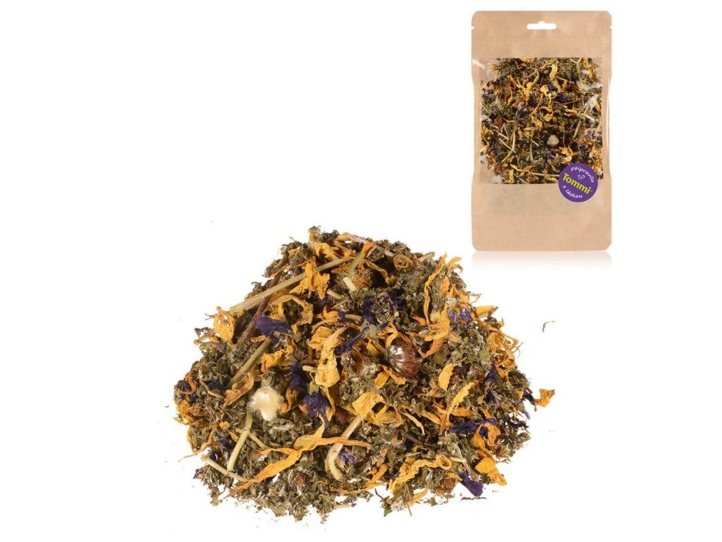 Sléz maurský – 5 %, Slunečnice (okvětní lístky) – 25 %, Pampeliška (květ) – 30 %, Malina (list) – 40 %