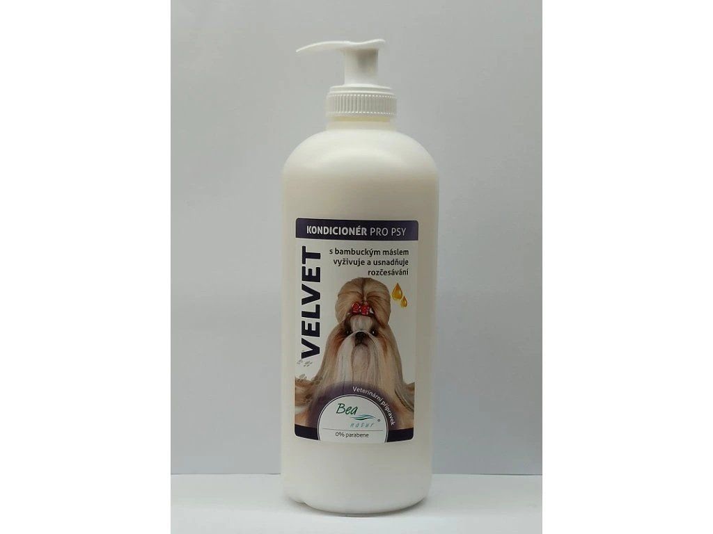 Oplachový kondicionér- rozčesávač. KONCENTRÁT. Oplachový kondicionér a rozčesávač srsti. Výrazně usnadňuje rozčesávání srsti, je antistatický, čímž omezuje plstnatění srsti a vytváření "uzlíků", dodává srsti vláčnost, vzdušnost a hedvábný lesk - podporuje zdravý růst. Po použití se srst stává nelétavou, jemnou a snáze udržovatelnou.Obsahuje ELASTIN pro pružnost a velké množství BAMBUCKĚHO MÁSLA( Shea Butter- olej z oříšků máslovníku), které udržuje srst krásnou, lesklou, vyživenou. Bambucké máslo má také hojivé účinky na kůži.Zabraňuje jenímu vysušování a svědění. Vhodný pro plemena, která je nutno kartáčovat a česat. Doporučujeme používat i mezi výstavami po každém koupání pro zabránění plstnatění a usnadnění údržby srsti. Na splstnatělou , zacuchanou nebo vysušenou ( zhrublou) srst doporučujeme použít Velvet zředěný v poměru 1:2 až 1:3 po koupání do mokré srsti,řádně zapracujeme do srsti, necháme chvíli působit a pak důkladně vypláchneme vodou. Pro srst udržovanou je možno použít Velvet zředěný až do poměru 1:10 jen tak na oplach.( Ředění je vždy individuální dle stavu a typu srti u každého jedince) Srst nakonec VŽDY VYSUSUŠTE VYSOUŠEČEM ZA STÁLÉHO ČESÁNÍ KARTÁČEM. Doporučujeme také jako základní kondicionér pro psí salony..